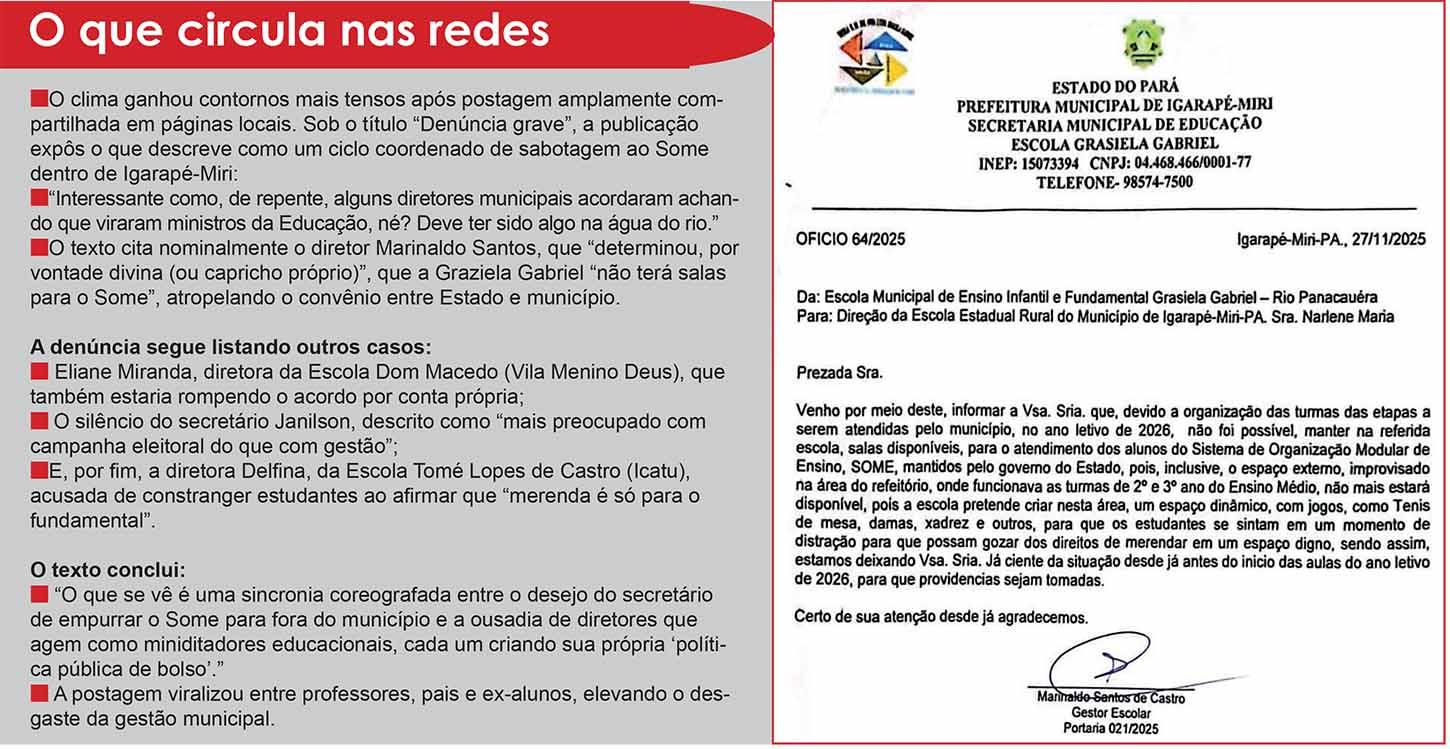 O caso mais recente vem de Igarapé-Miri, no Baixo Tocantins, onde um ofício assinado em 27 de novembro pelo gestor escolar Marinaldo Santos de Castro surpreendeu professores e estudantes da Escola Municipal Rural Graziela Gabriel, no rio Panacauera. O documento informa que não haverá salas disponíveis para atendimento do Some a partir de 2026. A justificativa: reorganização das turmas e transformação do espaço onde funcionam os 2º e 3º anos em “área dinâmica” para jogos e para garantir merenda em local “digno”.
