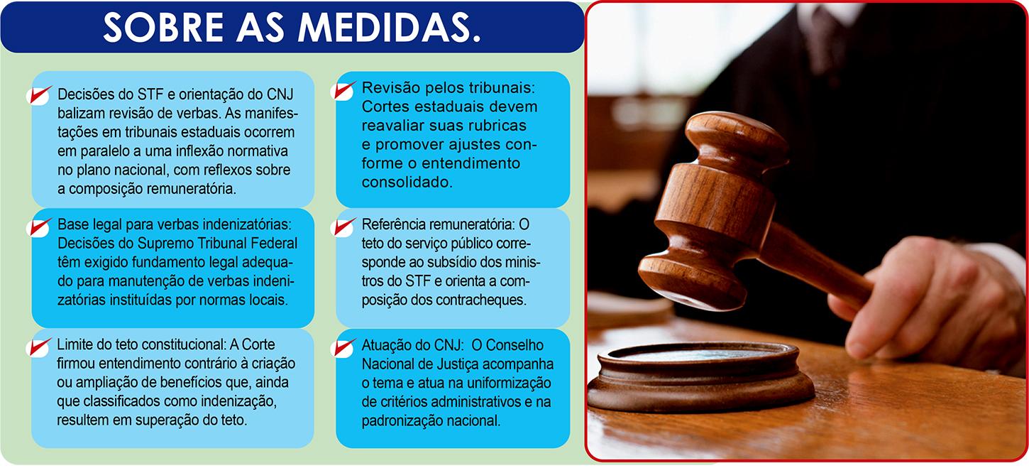 O pano de fundo envolve decisões do Supremo Tribunal Federal sobre a aplicação do teto constitucional e a revisão de verbas de natureza indenizatória. O tema também está sob acompanhamento do Conselho Nacional de Justiça, com foco na padronização de rubricas e observância dos limites remuneratórios.
